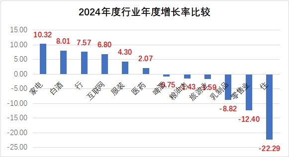 上表可见,2024年度家电行业的增长速度最高,平均增长10.32%。其次是白酒品牌增长8.01%。旅游行业最近几年受疫情影响最大,2023年度旅游业增速达到48.09%,2024年度增速则是-1.59%。客观分析,旅游业2023年度的高速增长是建立在2022年受疫情影响年度减速14.23%的基础之上。但是零售业的下降则是连年不断的,2022年下跌21.21%,2023年下跌24.23%,2024年下跌12.4%,表明实体零售连锁品牌逐步缩减或离场已是大势所趋。12个细分行业中,有6个出现年度负增长,依次是啤酒、粮油肉、旅游业、乳制品、零售业,降幅最大的是与住相关的品牌,2024年度降幅达到29%。见下表: