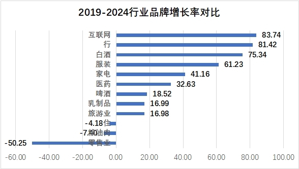 以疫情前一年2019年为分析基础,12个细分行业疫情以来5年增长速度比较,互联网5年增长83.74%,汽车及相关品牌增长81.42%,白酒增长75.34%,分别排在前三位。4年负增长的分别是与住、吃(粮油肉)相关的品牌,分别下降4.18%和7.4%,零售连锁的下降则高达50.25%。详见下表: